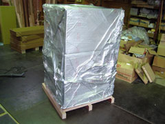 強化ダンボールに入った機械全体をフィルムで包みます。